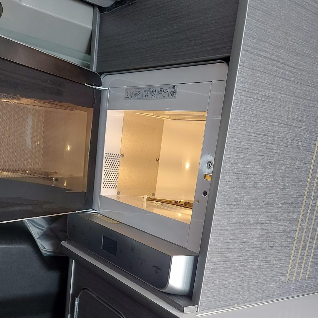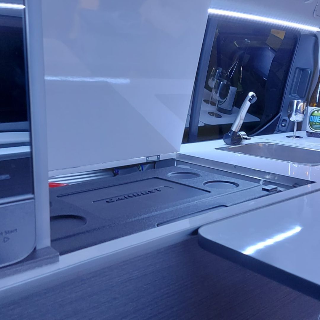 Pero no solo pensamos en la funcionalidad, también en el confort. Por eso, hemos añadido un microondas y una cafetera Nespresso para disfrutar de nuestras comidas favoritas y un buen café en cualquier momento. Y para aprovechar al máximo la energía solar, hemos instalado una placa solar en el techo.